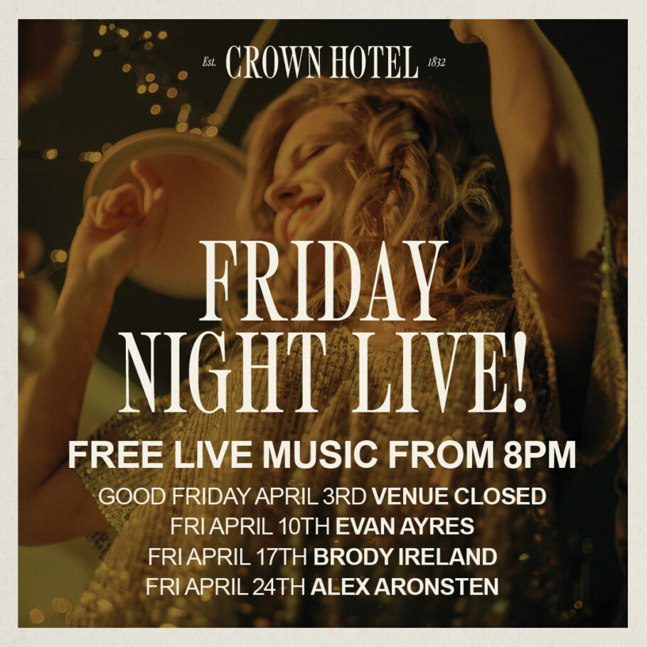Your Friday nights are sorted at The Crown! We’ve got a stellar lineup of live talent ready to help you shake off the work week. Please note: We are closed on Good Friday (April 3rd) to rest up for the rest of the weekend!